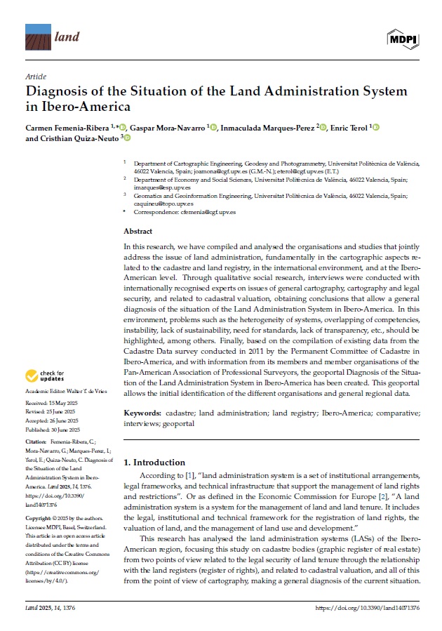 Los resultados de este proyecto han dado lugar a una artículo científico publicado en la revista «Land«, y titulado: «Diagnosis of the Situation of the Land Administration in Ibero-America«.